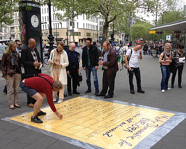 Wie kann Europa demokratischer werden? Dies war das Motto zweier Bodenzeitungen, die Aktive von Europa-Union und JEB am 9. Mai an zentralen Plätzen in Berlin zeigten. Am Ku’Damm und am Hackeschen Markt waren Passanten eingeladen, über Vorschläge für eine aktivere Demokratie auf europäischer Ebene abzustimmen. Die Aktion weckte viel Interesse bei Berlinern und internationalen Gästen und führte zu lebhaften Diskussionen über Europa. » weiterlesen