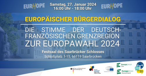Gemeinsam mit unserem Landesverband Europa-Union Saar laden wir Sie ganz herzlich zu unserem Europäischen Bürgerdialog "Die Stimme der deutsch-französischen Grenzregion zur Europawahl 2024" am 27. Januar 2024 in Saarbrücken ein. Kommen Sie ins Gespräch unter anderem mit Manuela Ripa, Mitglied des Europäischen Parlaments, Peter Gillo, Direktor des Regionalverbands Saarbrücken, und Roland Theis, Abgeordneter des saarländischen Landtags. » weiterlesen